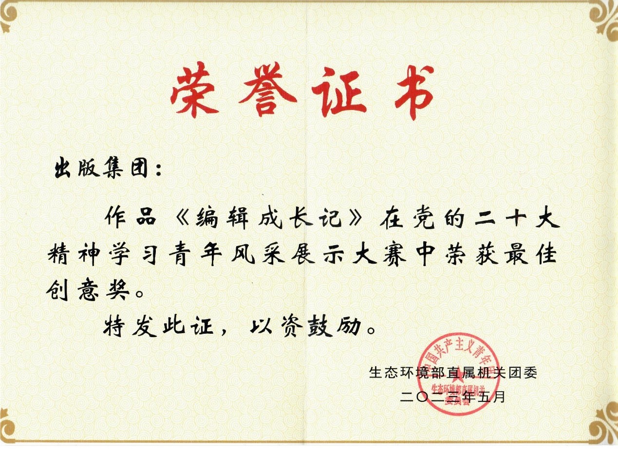 近日,在生態(tài)環(huán)境部直屬機(jī)關(guān)團(tuán)委黨的二十大精神學(xué)習(xí)青年風(fēng)采展示大賽中,出版集團(tuán)團(tuán)委報(bào)送的原創(chuàng)情景劇作品《編輯成長(zhǎng)記》榮獲“最佳創(chuàng)意獎(jiǎng)”。