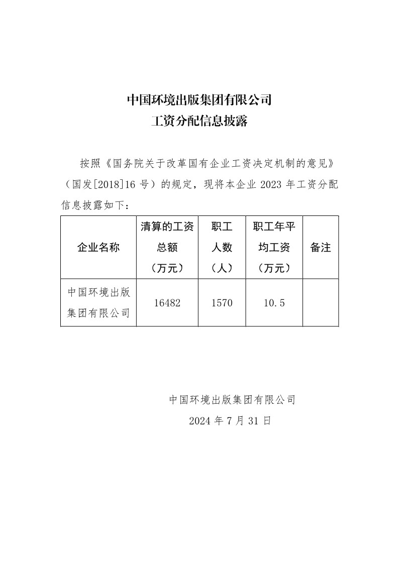 中國環境出版集團有限公司2023年工資分配信息披露