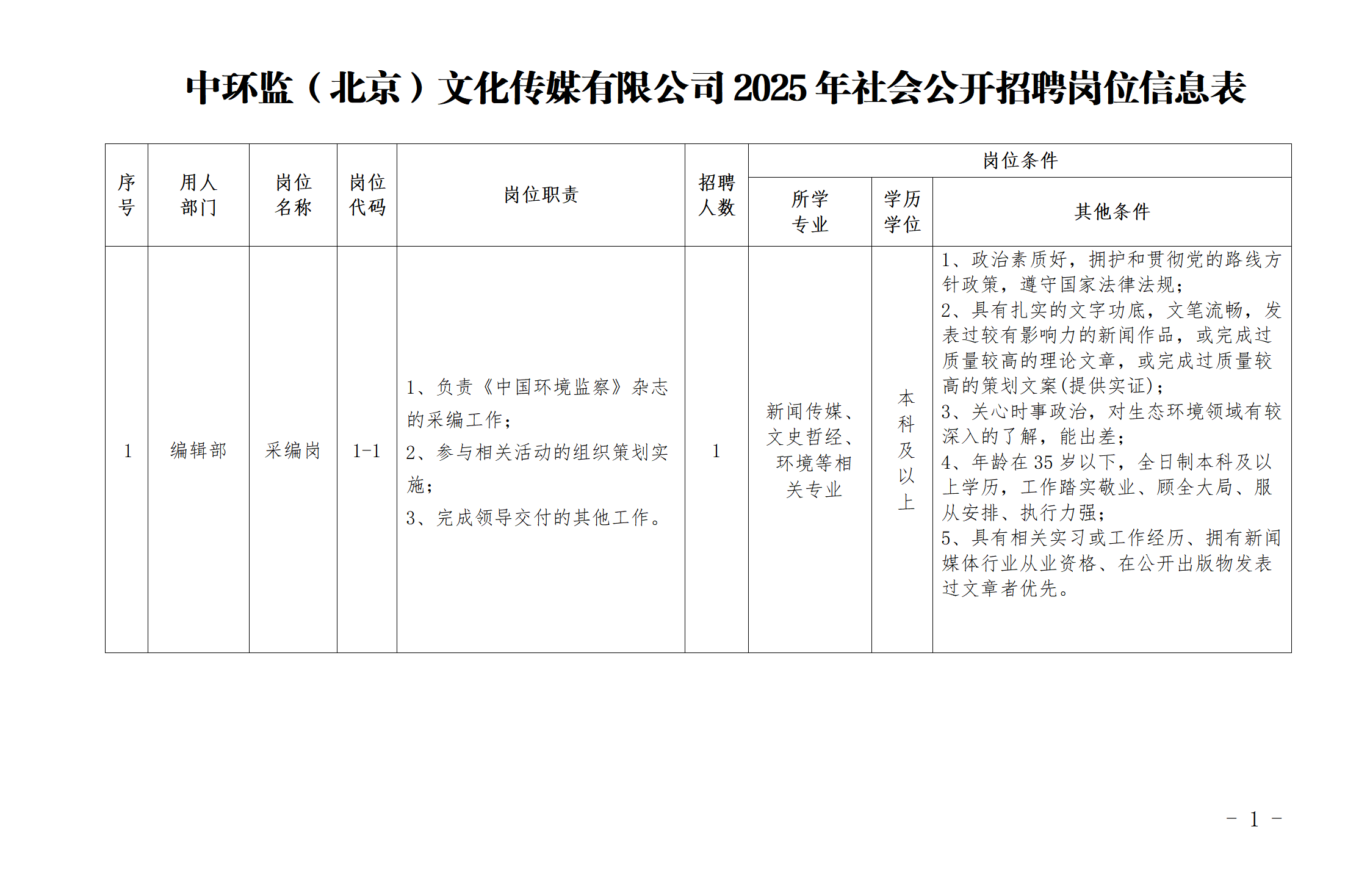 附:《中環(huán)監(jiān)(北京)文化傳媒有限公司2025年社會公開招聘崗位信息表》